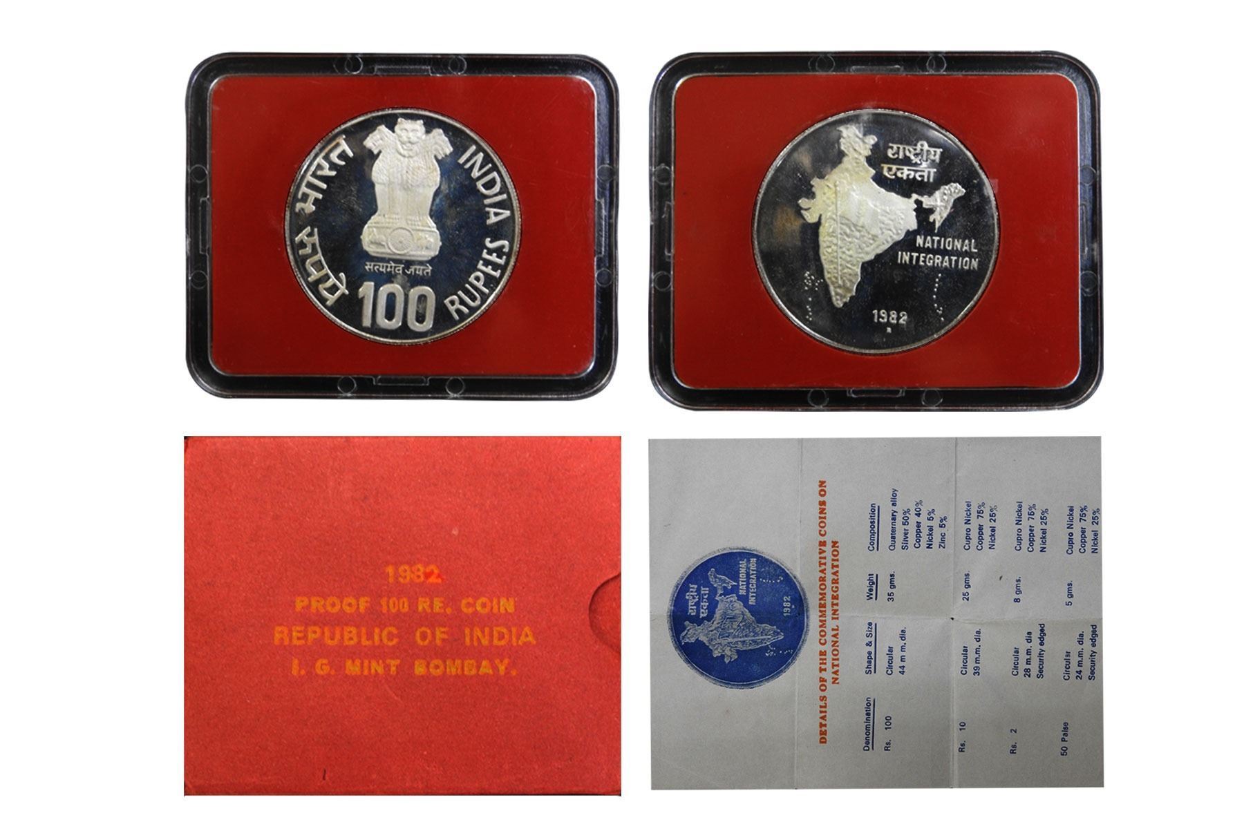 Republic India, National Integration, Proof, 100 rupees, Single coin set, 1982, Mint Condition with Box and