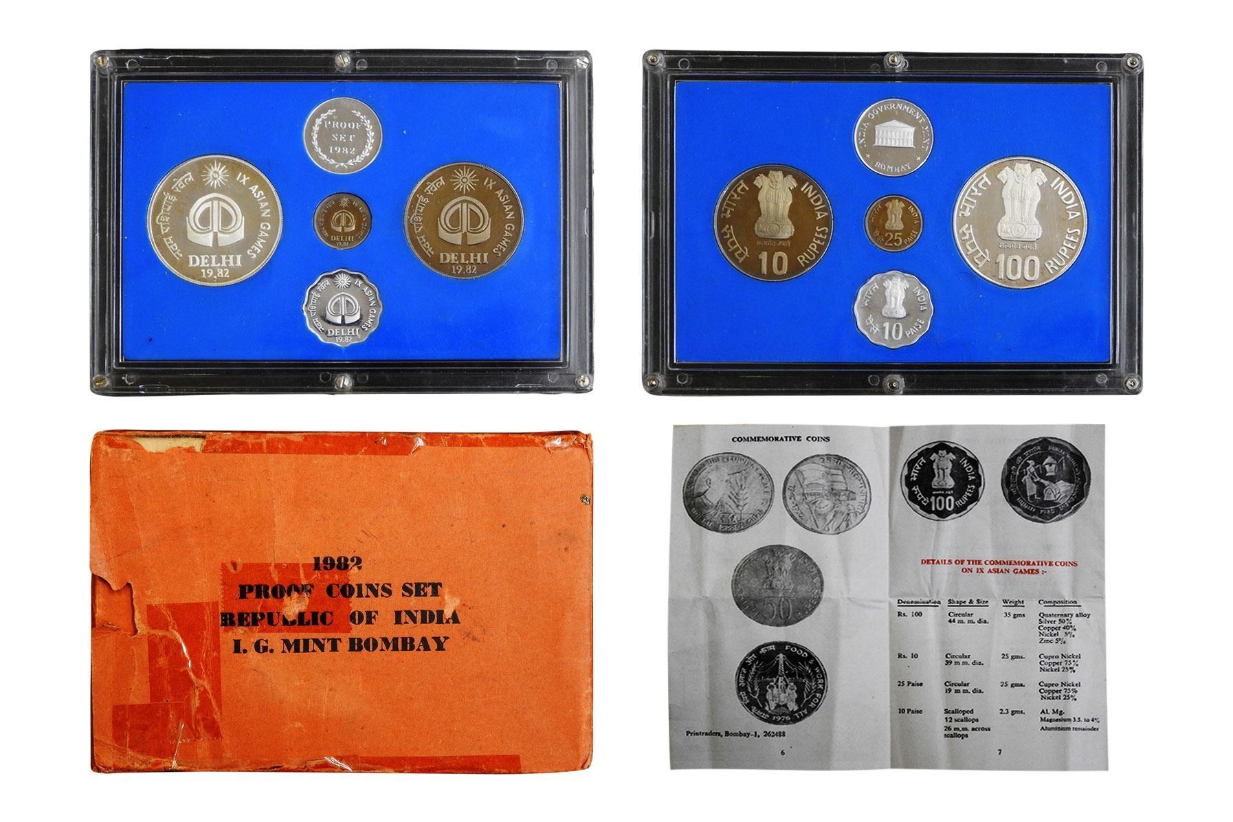 Republic India, Asian Games, 1982, Proof, 4 Coins set, 100 rupees, 10 rupees, 25 paisa, 10 paisa &