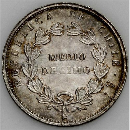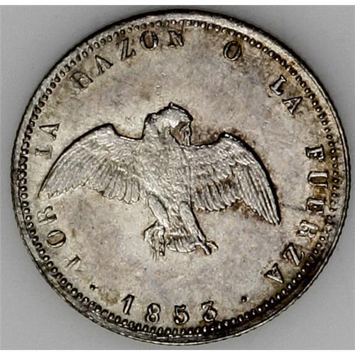 <B>Republic Medio (1/2) Decimo 1853, </B></I>KM121, nice lightly toned UNC with full underlying luster and excellent details on the condor. Very difficult to find in Mint State.