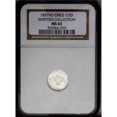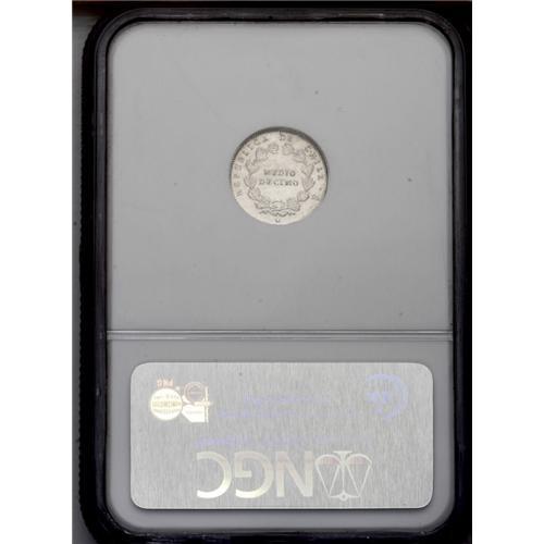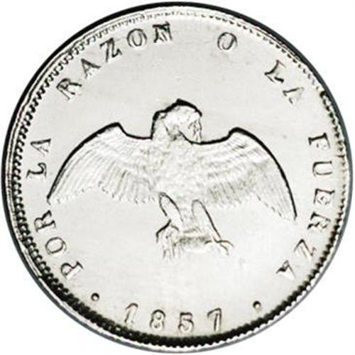 <B>Republic Medio Decimo 1857, </B></I>KM121, MS63 NGC, full frosty white luster and sharp details throughout.