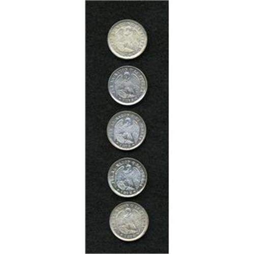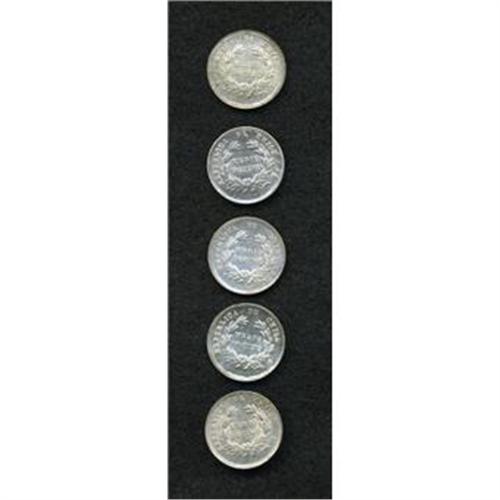 <B>Republic Medio Decimo Choice Quintet, </B></I>KM137.2, 1874, gem toned UNC, 1875, 5/5/4 overdate, UNC, 1876, choice lightly toned UNC, 1877, superb toned UNC, just a jewel, and 1878, fully lustrous UNC, light golden patina.