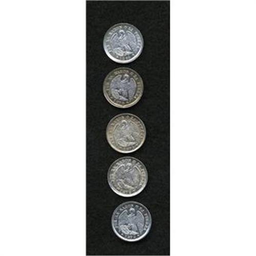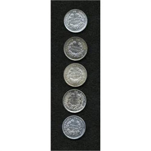 <B>Republic Medio Decimo Date Selection, </B></I>KM137.2, five different dates, 1869, choice BU, 1870, superb lightly toned UNC, 1871, choice toned UNC, 1872, sharply detailed UNC, and 1873/2, nice AU/XF.