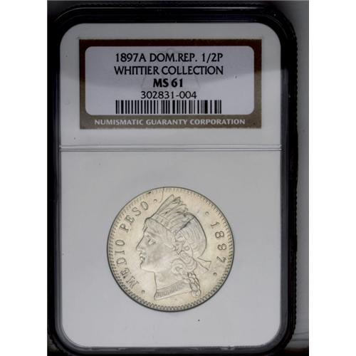 <B>Republic Medio Peso 1897A, </B></I>KM15, MS61 NGC, an exceptionally choice example of this type which is decidely rare in true mint state. The surfaces are somewhat prooflike and the design details are sharp. One light planchet flaw on the Indian's hair is the only blemish on this otherwise superb coin.