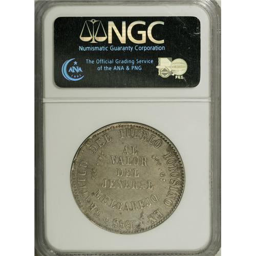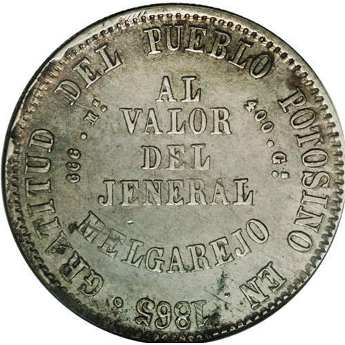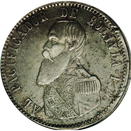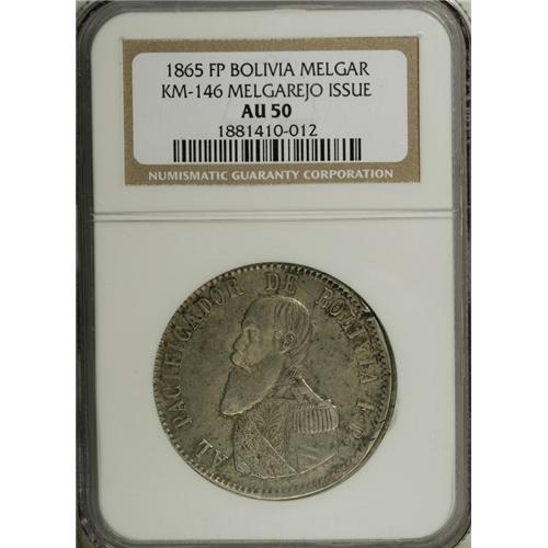 <B>Republic Melgarejo 1865-FP, </B></I>KM146, AU50 NGC, extremely sharp details for this type with nicely toned surfaces, one small edge crack as made. Very scarce in this quality.<BR><BR><b>Shipping:</b> Coin/Currency (<a target="_blank" href="http://www.heritageauctions.com/common/shipping.php">view shipping information</a>)