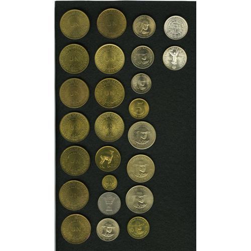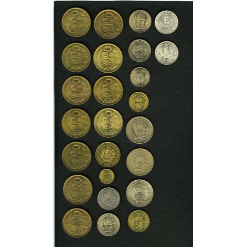 <B>Republic - Modern Types and Dates, </B></I>twenty-five coins, all UNC or Proof, featuring: KM222 Sol, 1943, 1944, 1946, 1947, 1948, 1951, 1952, 1955, 1956, 1957, 1961, 1966, and 1978 plus modern types including two marked "Pareja" or Proof. 5 Sols: 1969, 1971, 1972, 1975, 1976, and 1979. 10 Sols: 1971, 1972, 1975, and 1979. 20 Sols: 1966 and 1965. Many of the base metal types are very elusive in unblemished mint state. <B>Sold as is, no return lot.</B></I>