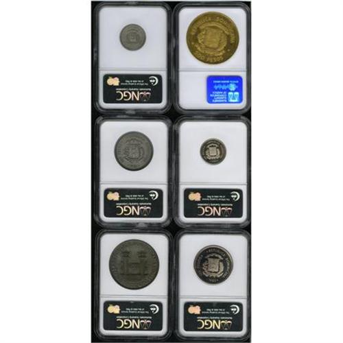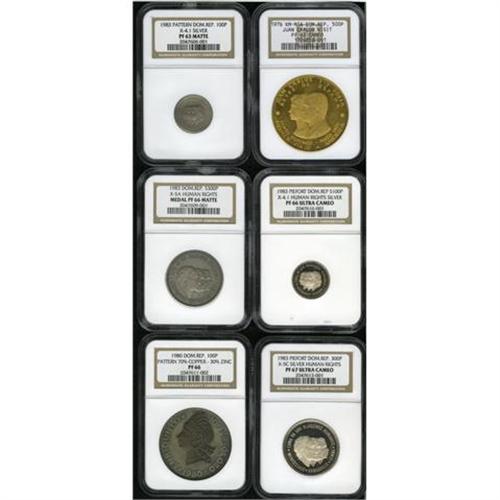 <B>Republic NGC Certified Proofs and Patterns, </B></I>six modern issues as follows: KM-M1A 500 Pesos 1976 Proof 63 Cameo, appears to be 14 carat gold but could be gold-plated, 100 Pesos 1983 KM-X4, Proof 63 Matte and Proof 66 Ultra Cameo, 300 Pesos 1983 Human Rights KM-X5, Medal Proof 66 Matte and Proof 67 Ultra Cameo, and 100 Pesos 1980 Pattern (like KM-X3) 70% copper, 30% zinc, Proof 66. <B>Sold as is, no return lot.</B></I><BR><BR><b>Shipping:</b> Coin/Currency (<a target="_blank" href="http://www.heritageauctions.com/common/shipping.php">view shipping information</a>)