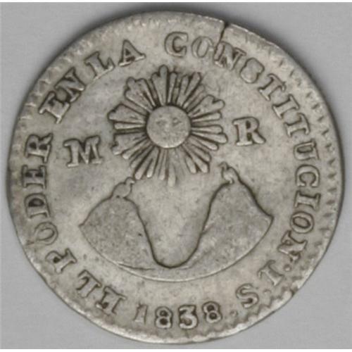 <B>Republic - Nice Type and Date Selection, </B></I>KM22 1/2 Real 1838-ST, crude AVF, tiny edge crack, KM13 Real, three dates, 1833-GJ, nice toned VF, 1834-GJ, bold VF+, holed and plugged at the top, and 1835-GJ, Fine, KM17 Real 1840-MV, two examples, VG-F, few tiny scratches, coin rotation, and crude AVF, medal rotation, and KM14 2 Reales 1835-GJ, attractive VF for this series. A very useful group of these early types. <B>Sold as is, no return lot.</B></I>