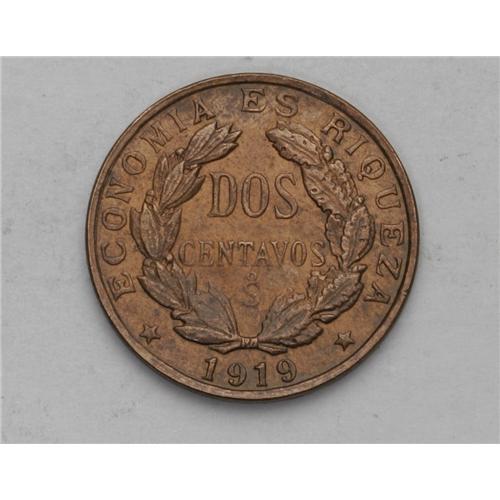 <B>Republic Pair of 2 Centavo Types, </B></I>KM147a, 1894, nice brilliant UNC, and KM164, 1919, toned AU-UNC, considerable mint luster.