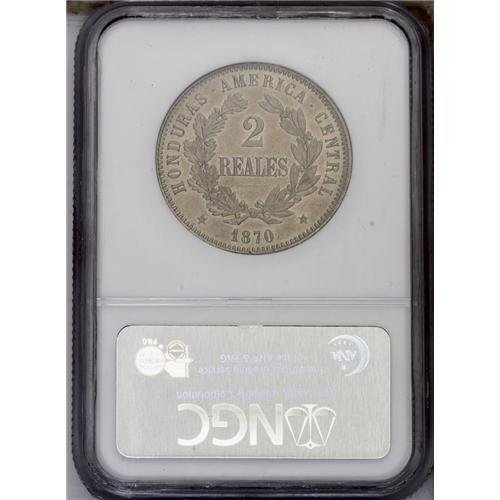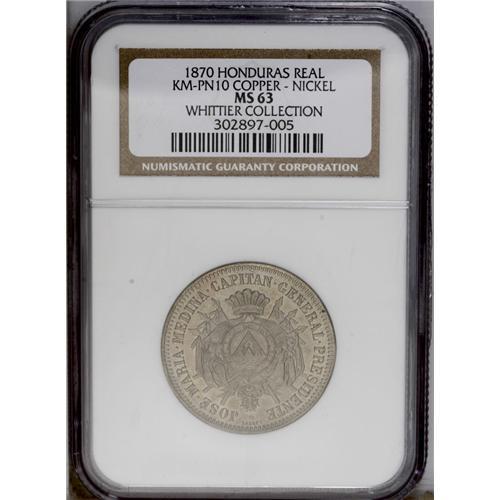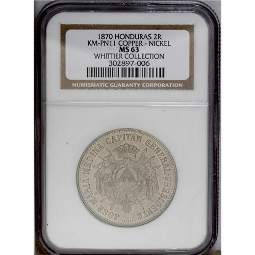 <B>Republic - Pair of Copper-Nickel Patterns 1870, </B></I>KM-Pn10 Real, MS63 NGC, very lightly toned, and KM-Pn11 2 Reales, MS63 NGC, a beautiful example with full mint brilliance and choice original patina. Scarce and desirable duo.