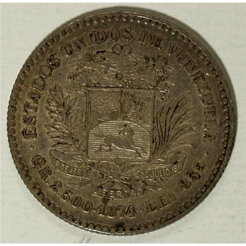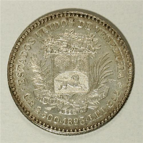 <B>Republic - Pair of Silver Types, </B></I>KM-Y13.1 10 Centavos 1874A, mintmark with serifs, toned AU with one tiny mark in the left obverse field, and KM-Y21 1/2 Bolivar 1893A, highly lustrous AU-UNC, some small marks in the obverse fields.<BR><BR><b>Shipping:</b> Coin/Currency (<a target="_blank" href="http://www.heritageauctions.com/common/shipping.php">view shipping information</a>)