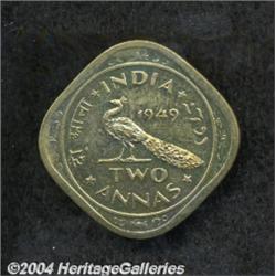 Republic. Pattern 2 Annas 1949, similar to KM-Pn10, but struck in brass or aluminum-bronze instead of copper-nickel. Nice Proof, peacock walking to left, diamond-shaped. Undoubtedly very rare, and an important issue of the emerging republic. Important notice: Heritage usually auctions material at the rate of 200-250 lots per hour. On some occasions eBay Live bid software or the Internet may not be able to keep up with the pace of the auction. We recommend placing a realistic absentee bid now as insurance to avoid disappointment. Occasionally the auctioneer may eliminate or reject an eBay Live bid, and the auctioneer may also reopen a lot after the close of the eBay live bidding (usually because we missed an audience bid), and may reject your bid even if it shows you as the winning bidder. By bidding via eBay Live, you agree that Heritage may award the lot to another bidder at its sole discretion under the circumstances described above or any other reasonable circumstances. Also please note that all Heritage lots purchased through eBay Live carry a 20% Buyer's Premium. Please make sure you read the Terms and Conditions before you bid.