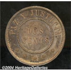 <B>Republic Pattern 2 Centavos 1868, </B></I>KMPn-21, nice lightly toned Proof, appears to be bronze rather than brass, as listed by KM. <BR><BR><B>Important notice:</B> Heritage usually auctions material at the rate of 200-250 lots per hour. On some occasions eBay Live bid software or the Internet may not be able to keep up with the pace of the auction. We recommend placing a realistic absentee bid now as insurance to avoid disappointment. Occasionally the auctioneer may eliminate or reject an eBay Live bid, and the auctioneer may also reopen a lot after the close of the eBay live bidding (usually because we missed an audience bid), and may reject your bid even if it shows you as the winning bidder. By bidding via eBay Live, you agree that Heritage may award the lot to another bidder at its sole discretion under the circumstances described above or any other reasonable circumstances. Since eBay bids are not shown to us until we open the lot on the floor, we treat those bids just like floor bids. In most cases the floor responds before the eBay bid is presented to us, due to Internet lag time, so for consistency we have made it a policy that floor bids are always considered first over tie eBay live bids. Also please note that all Heritage lots purchased through eBay Live carry a 20% Buyer's Premium. Please make sure you read the Terms and Conditions before you bid.