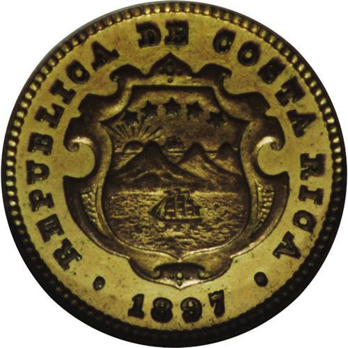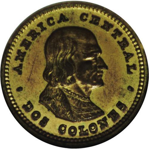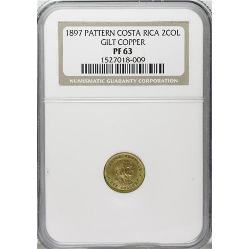 <B>Republic Pattern 2 Colones 1897 in gilt copper,</B></I> Proof 63 NGC. A pattern, or Proof only date with silver and copper patterns known, but this is the only 1897 denomination known as a gilt copper pattern. A unique U.S. mint product.<BR><BR><b>Shipping:</b> Coin/Currency (<a target="_blank" href="http://www.heritageauctions.com/common/shipping.php">view shipping information</a>)