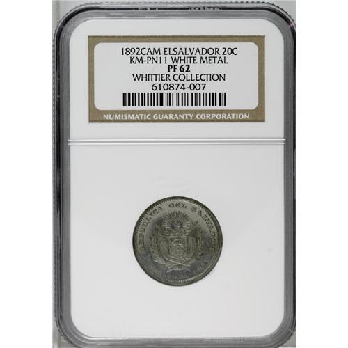 <B>Republic Pattern 20 Centavos 1892-CAM, </B></I>KM-Pn11, Proof 62 NGC, very bright mint color with just a scattering of tiny spots. Rare pattern in white metal.
