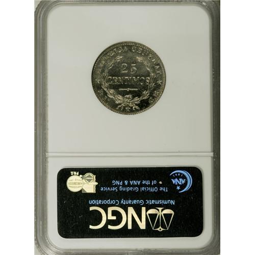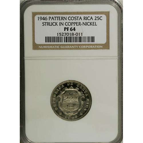 <B>Republic Pattern 25 Centimos 1946 in copper-nickel,</B></I> not a Piefort, Proof 64 NGC. Missing from all major collections and the Banco Central Museum. Possibly unique.<BR><BR><b>Shipping:</b> Coin/Currency (<a target="_blank" href="http://www.heritageauctions.com/common/shipping.php">view shipping information</a>)