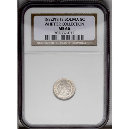 <B>Republic Pattern 5 Centavos 1872-FE, </B></I>KM156.3, nine stars, MS66 NGC, a superbly struck coin with flashy, prooflike surfaces. Clearly a specimen or pattern strike and unlisted as such.