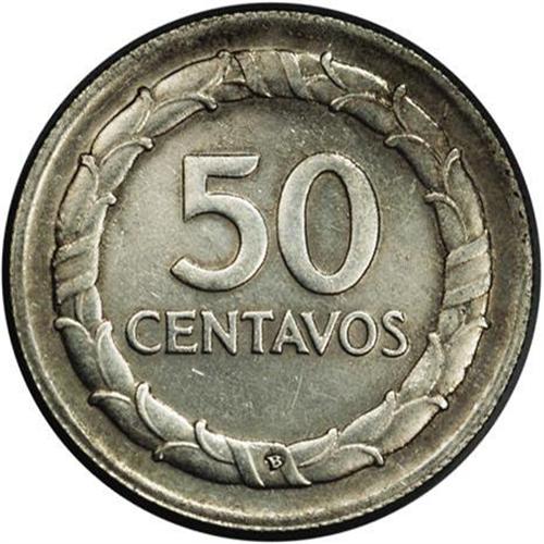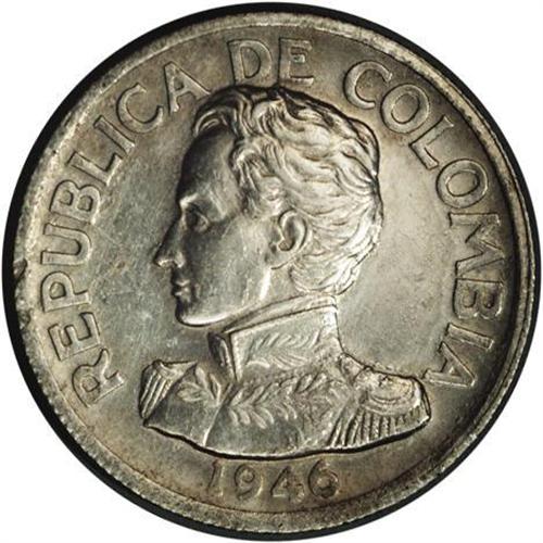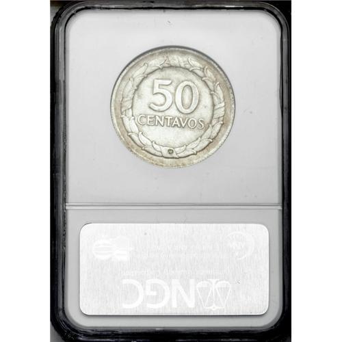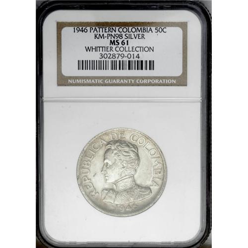 <B>Republic Pattern 50 Centavos 1946, </B></I>KM-Pn98, silver with reeded edge, MS61 NGC, lightly toned with reflective fields, some small surface marks which apparently affected the NGC grading. Very rare.
