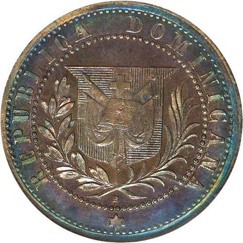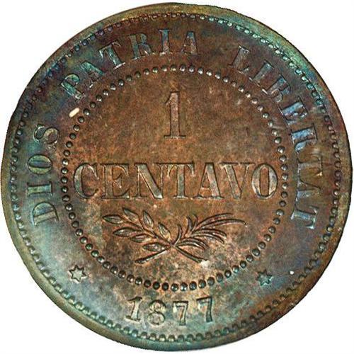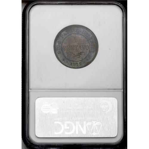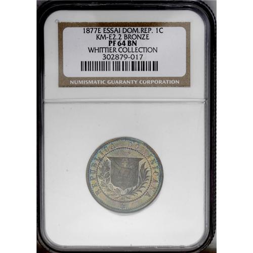 <B>Republic Pattern Centavo 1877E, </B></I>KM-E2.2, Proof 64 NGC Brown, highly reflective fields and pretty blue-green toning.