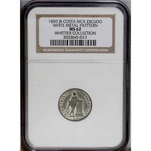 <B>Republic Pattern Escudo 1850-JB, </B></I>type of KM98, MS62 NGC, struck in white metal, very attractive with considerable original mint luster and no obvious oxidation. Extremely rare.