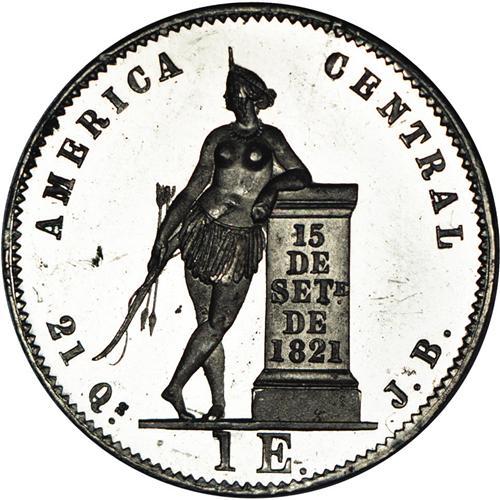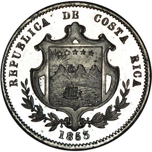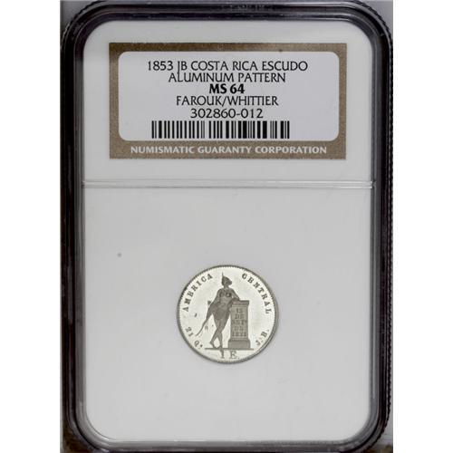 <B>Republic Pattern Escudo 1853-JB, </B></I>type of KM98, pattern in white metal, MS64 NGC, choice prooflike fields and full mint brilliance, an extremely rare and most attractive artifact of early Costa Rican numismatic history. Ex-Farouk Collection.