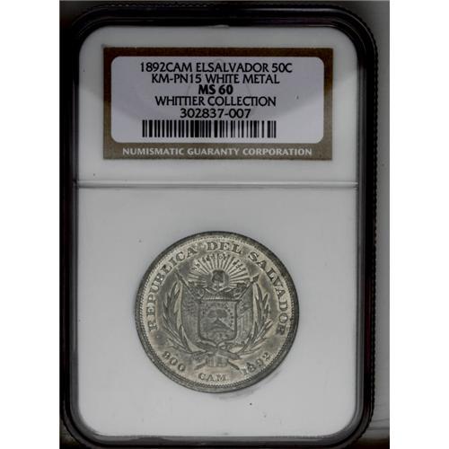 <B>Republic Pattern Flag 50 Centavos 1892-CAM, </B></I>KM-Pn15, MS60 NGC, a lustrous example with just a couple of tiny oxidation spots, not distracting. A rare pattern in white metal and more appealing than the MS60 grade would indicate.