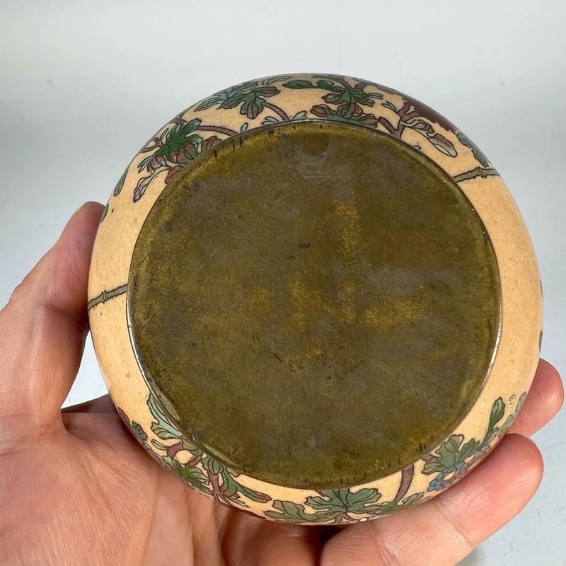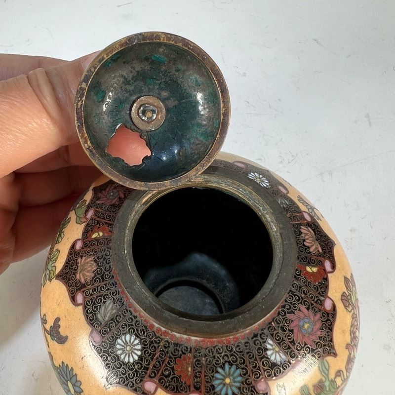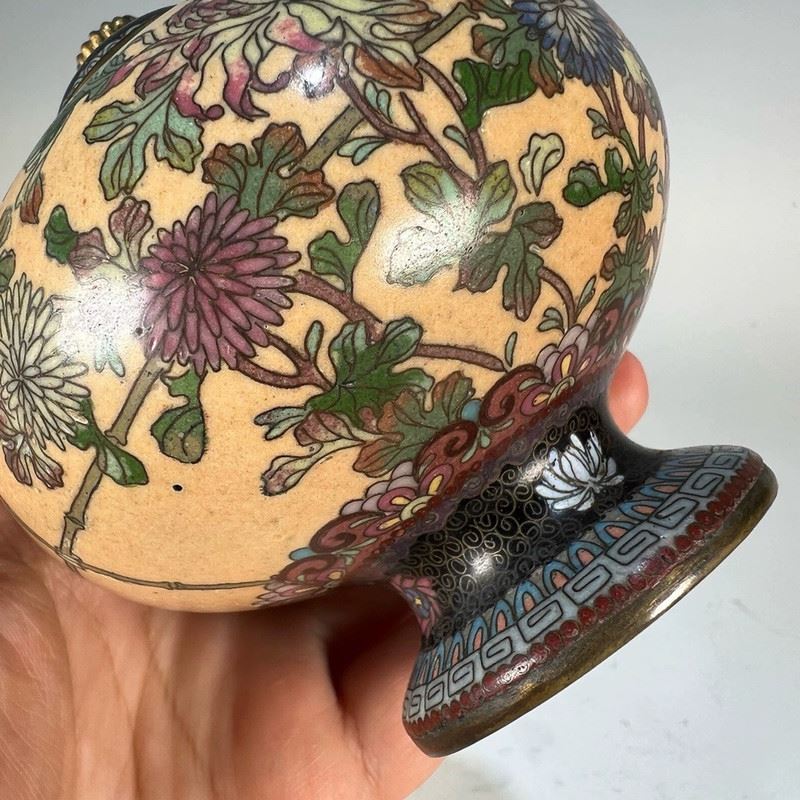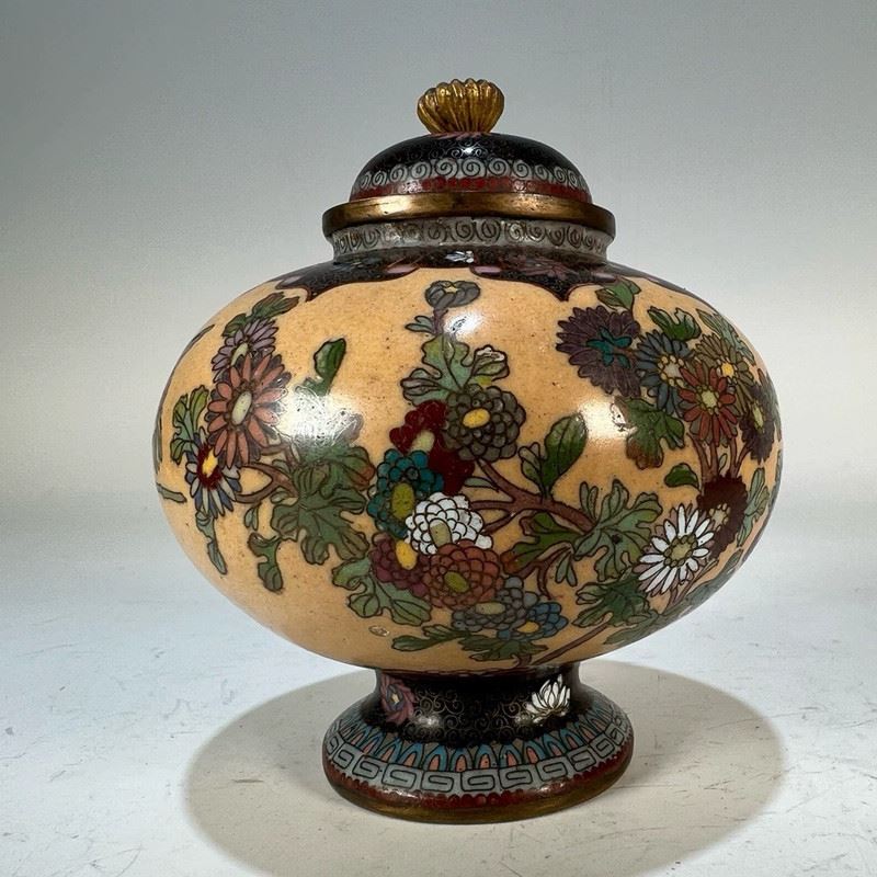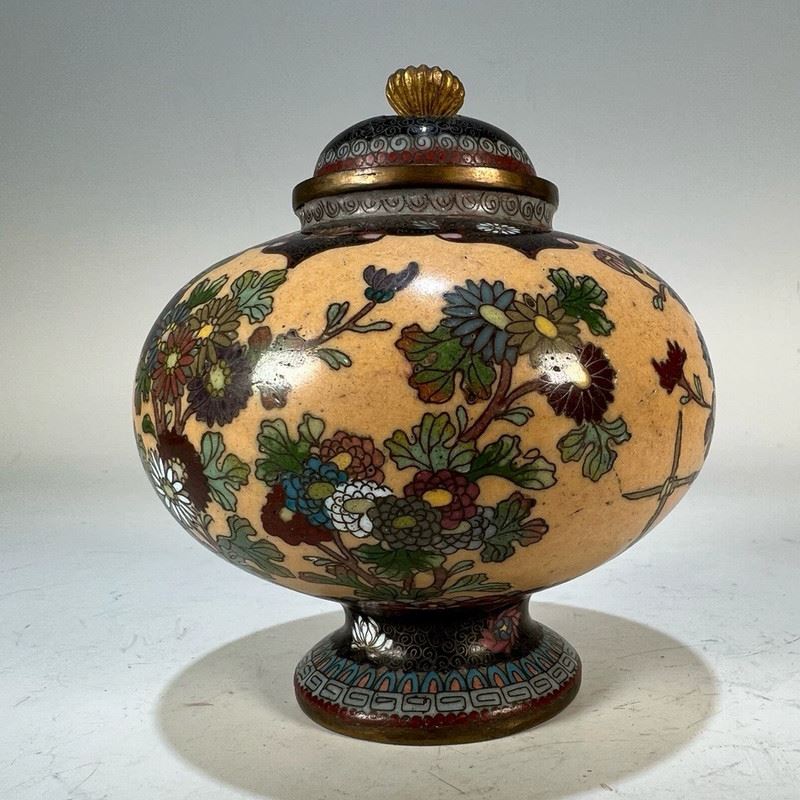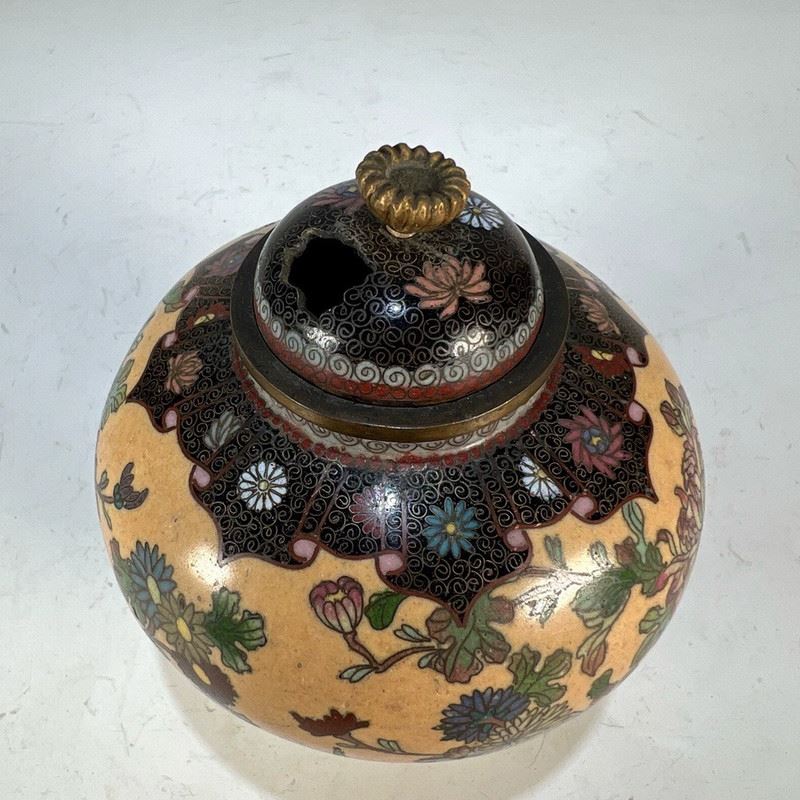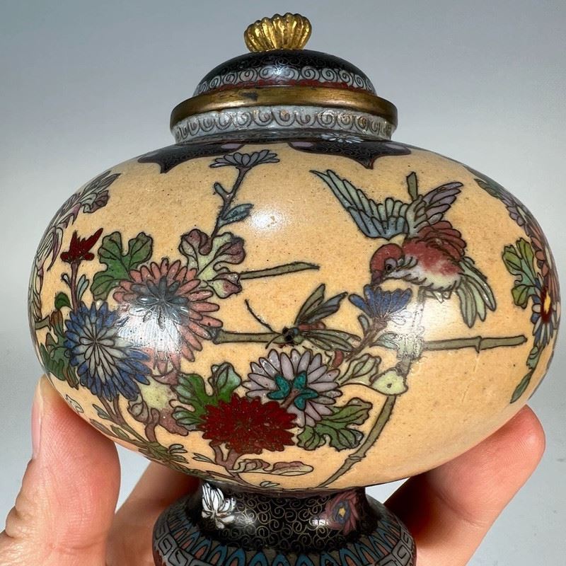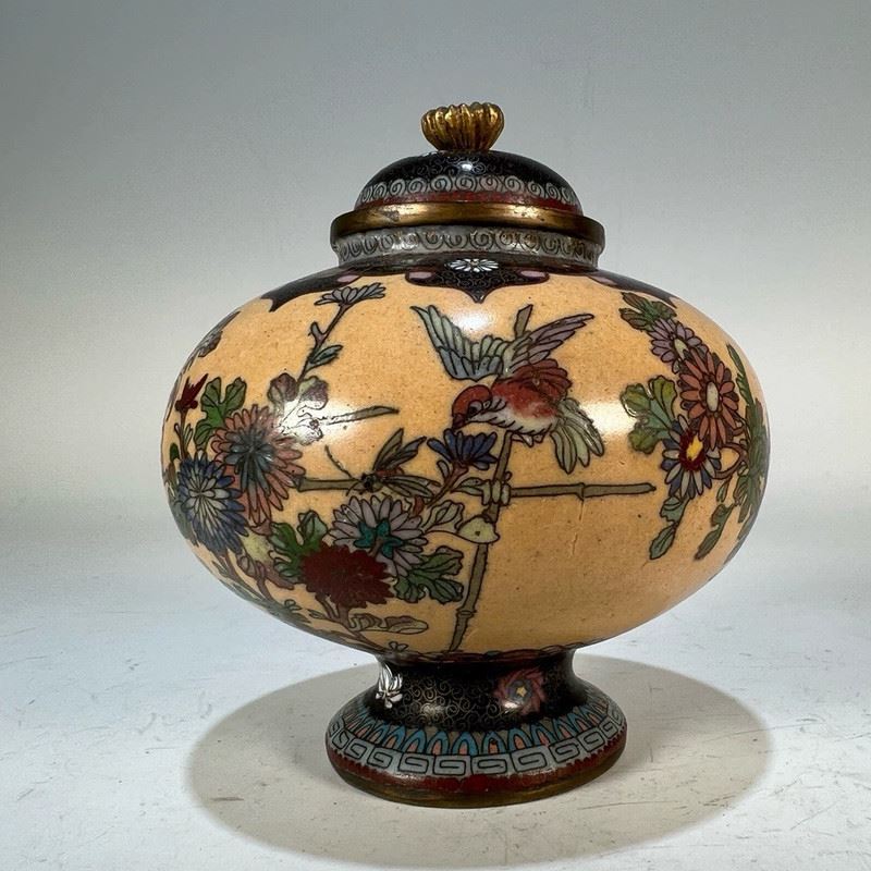 This Republic-period cloisonné incense burner features a globular body with a domed lid and gilt animal-ring handles. The entire surface is decorated in a continuous scene of birds among blossoming branches, set against a vivid orange ground. The enamels are brightly colored and evenly applied, showcasing refined cloisonné craftsmanship. Resting on a circular foot, the piece exudes both elegance and vitality, making it a fine example of decorative and collectible cloisonné incense burners from the Republic era.