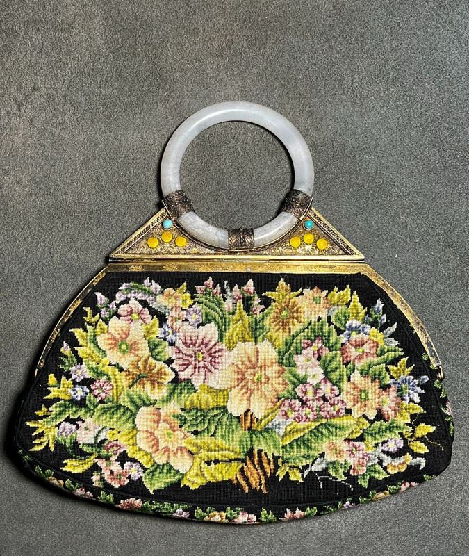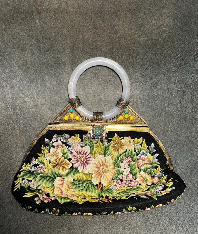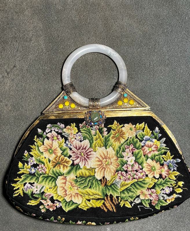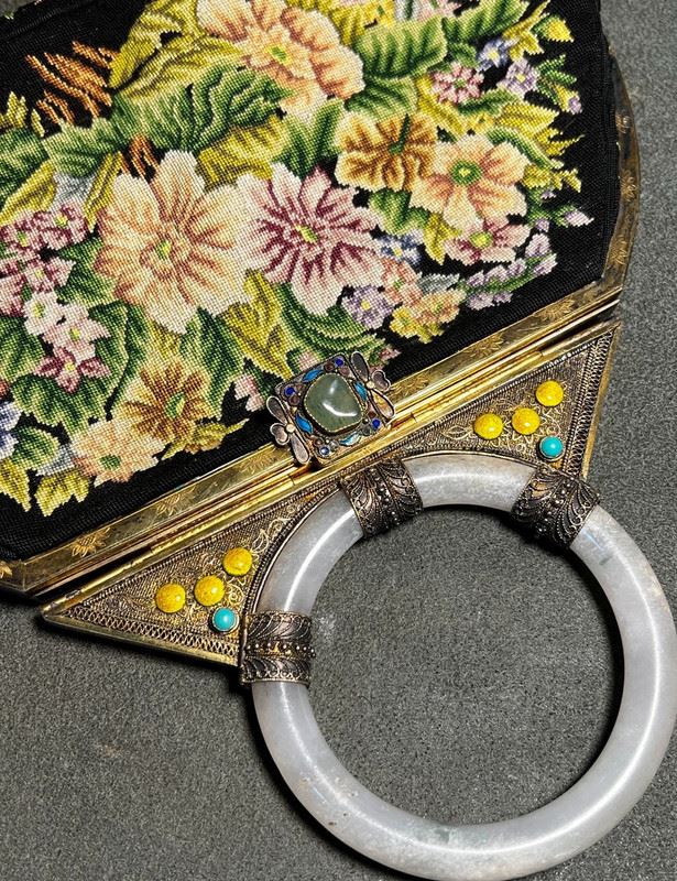 This elegant Republic Period handbag combines fine embroidery with luxurious materials. The black textile body is beautifully embroidered with colorful floral motifs in meticulous detail. The gilt-metal mounts are set with semi-precious stones, with a central jadeite piece enhancing its splendor. Most striking is the handle, crafted from a single piece of Hetian white jade, adorned with jadeite and gemstones, designed in the form of a bangle, both functional and decorative. A rare fusion of textile artistry, metalwork, and jade craftsmanship, this handbag exemplifies the refined taste and fashion of the Republic era, making it a highly collectible piece.