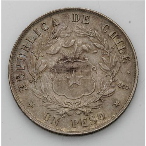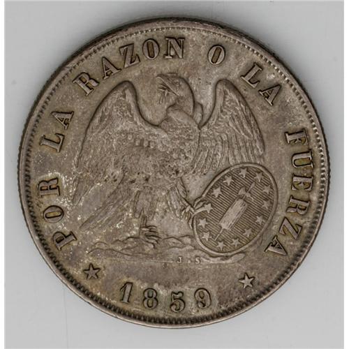 <B>Republic Peso 1859/8, </B></I>KM129, attractively toned VF-XF, some underlying luster on the reverse, very bold overdate, minor patination on the reverse shield.