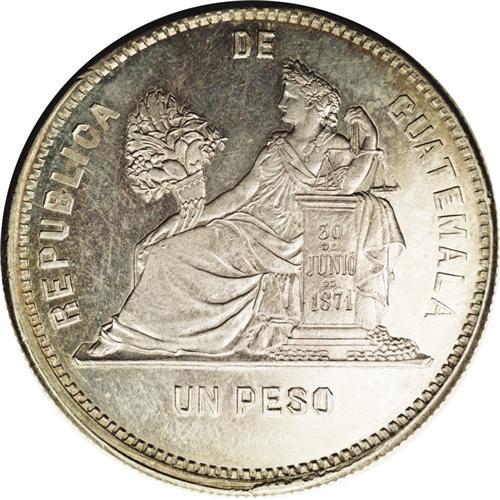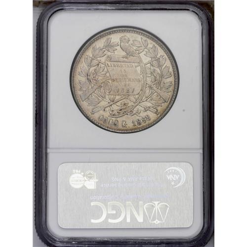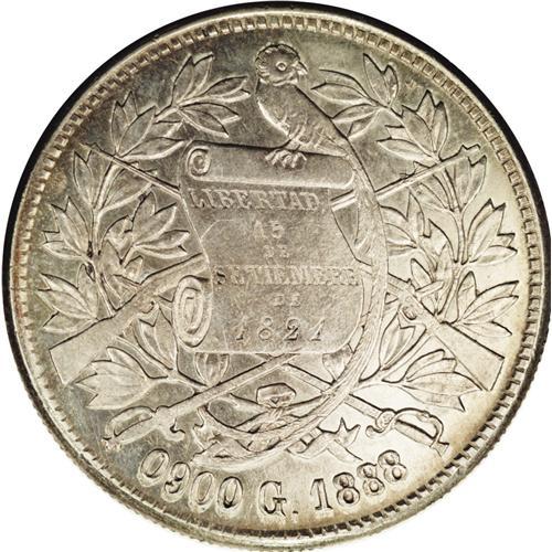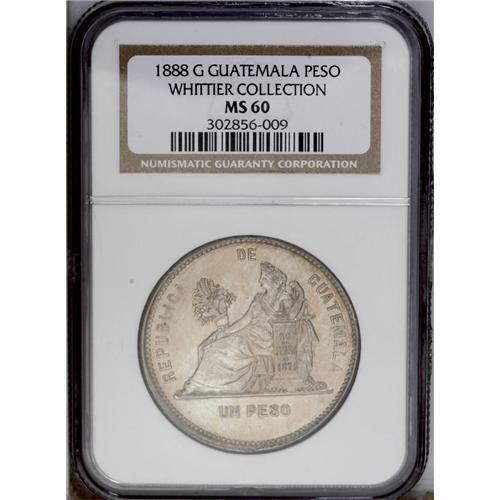 <B>Republic Peso 1888G, </B></I>KM207, MS60 NGC, an extremely attractive example of this rare type and date with prooflike mint luster and light champagne toning. The details are also very bold and the overall eye appeal is well above the NGC designation. The first 8 of the date appears to be punched over a 7 as the spike of the 7 is clearly visible at the upper right side of the 8, and this variety is currently unlisted and unknown!