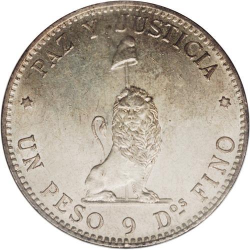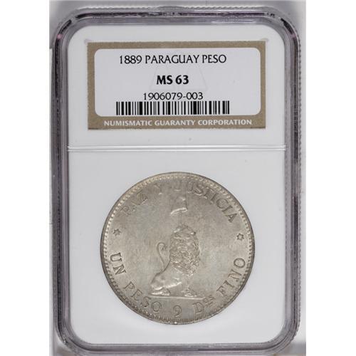 <B>Republic Peso 1889, </B></I>KM5, MS63 NGC, fully lustrous with light toning, a nice example of this type.<BR><BR><b>Shipping:</b> Coin/Currency (<a target="_blank" href="http://www.heritageauctions.com/common/shipping.php">view shipping information</a>)