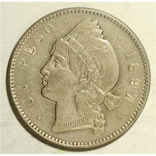 <B>Republic Peso 1897, </B></I>KM16, XF, lightly cleaned at one time and now beginning to tone, scarce grade for this low silver fineness issue, 0.35 silver.<BR><BR><b>Shipping:</b> Coin/Currency (<a target="_blank" href="http://www.heritageauctions.com/common/shipping.php">view shipping information</a>)