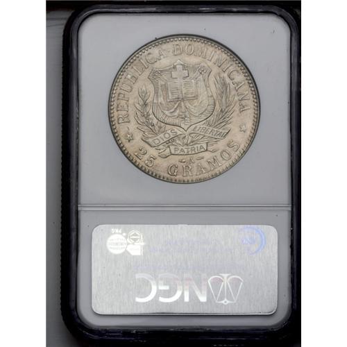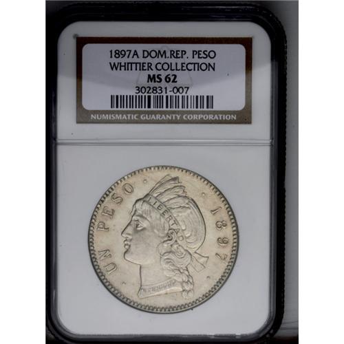 <B>Republic Peso 1897A, </B></I>KM16, MS62 NGC, a superb lightly toned coin with full underlying mint luster and excellent eye appeal. This type is notoriously rare in mint state because the .350 fineness planchets showed circulation wear almost immediately on the high points.