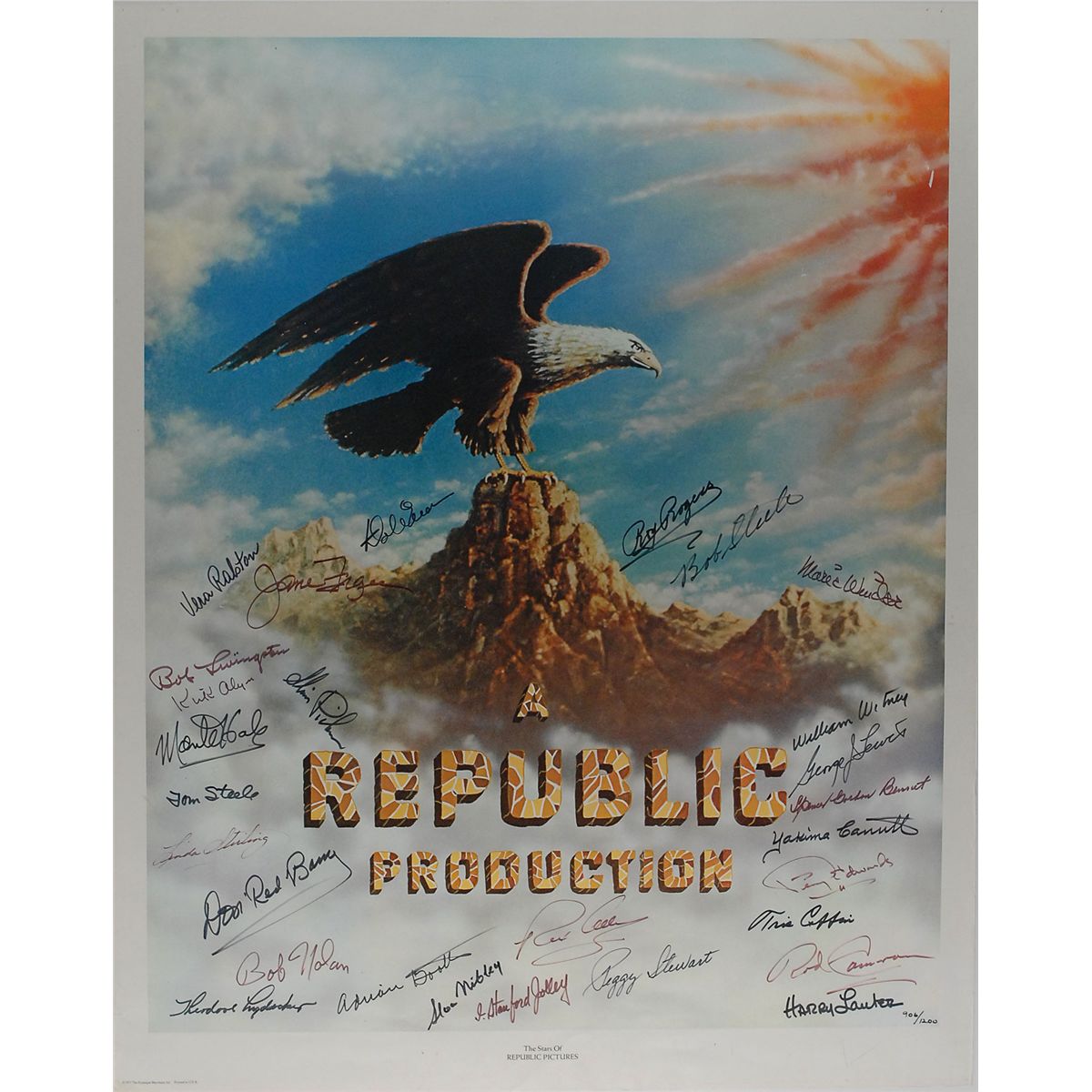 Color limited edition 24 x 30 lithograph entitled ‘The Stars of Republic Pictures,’ numbered 906/1200, signed in various color felt tip by 28 stars including: Roy Rogers, Dale Evans, Marie Windsor, Vera Ralston, Robert Livingston, Kirk Alyn, Slim Pickens, Tommy Steele, Don ‘Red’ Barry, Bob Nolan, Rex Allen, Adrian Booth, I. Stanford Jolley, Jane Frazee, Tris Coffin, Rod Cameron, Yakima Canutt, Spencer Gordon Bennett, Bob Steele, Theodore Lydecker, Peggy Stewart, Penny Edwards, William Witney, Monte Hale, George J. Lewis, Harry Lauter, Sloan Nibley, and Linda Stirling. Printed date 1977. Rolled and in fine condition, with some scattered light edge dings and creases, a small tear to bottom edge, and tape remnants to reverse.