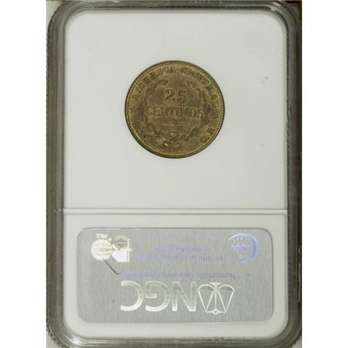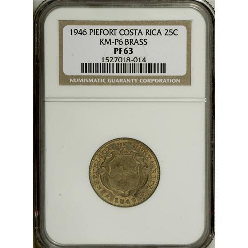<B>Republic Piefort Pattern 25 Centimos 1946 in brass,</B></I> KM-P6, Proof 63 NGC. Well struck with considerable original mint-red color remaining. Very rare with 4-6 pieces known.<BR><BR><b>Shipping:</b> Coin/Currency (<a target="_blank" href="http://www.heritageauctions.com/common/shipping.php">view shipping information</a>)