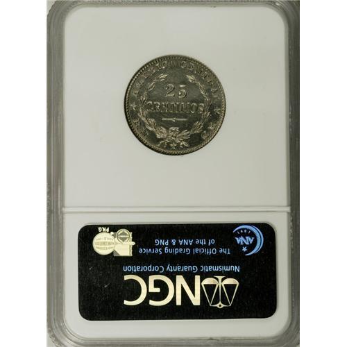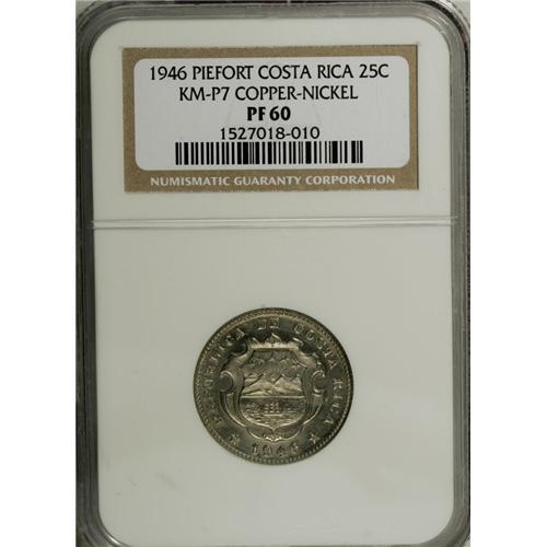 <B>Republic Piefort Pattern 25 Centimos 1946 in copper-nickel,</B></I> KM-P7, Proof 60 NGC. Bright, with a hint of reverse porosity. Very rare with only 3-4 pieces known.<BR><BR><b>Shipping:</b> Coin/Currency (<a target="_blank" href="http://www.heritageauctions.com/common/shipping.php">view shipping information</a>)