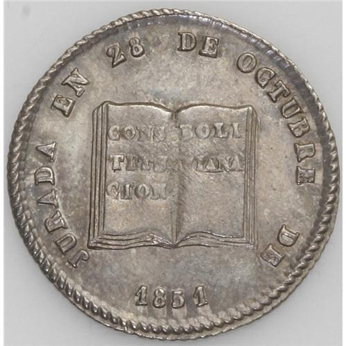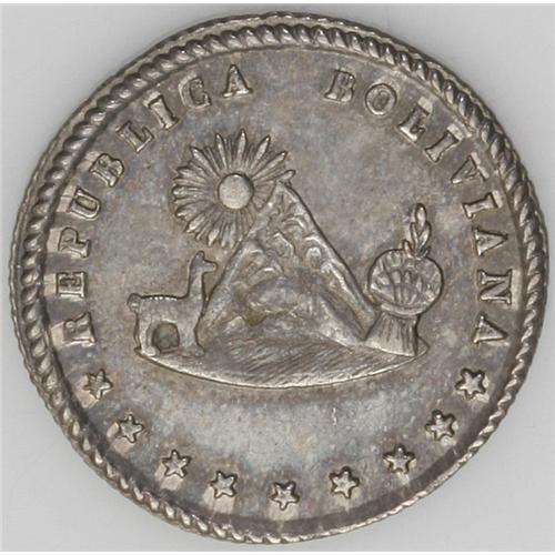 <B>Republic Proclamation 1 Sol 1851, </B></I>Burnett 37.1, toned AU, very attractive and rare when un-holed. Obv: Llama with mountain and sun; Rev: Bolivian Constitution (book.)