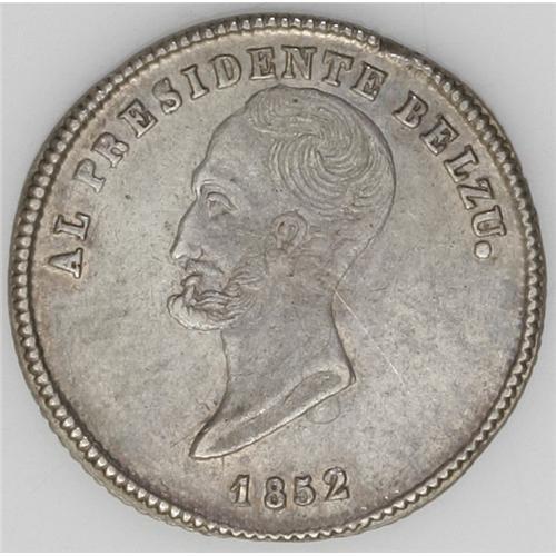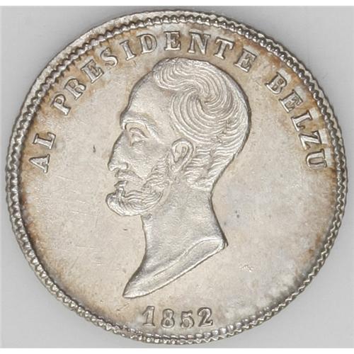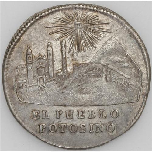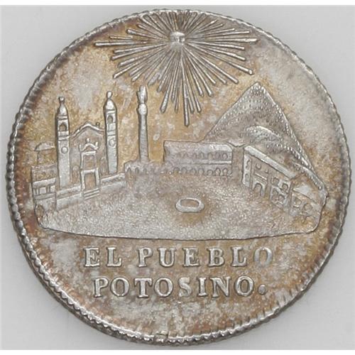 <B>Republic Proclamation 1 Sol 1852 - Two Varieties, </B></I>Burnett 51A1, superb toned AU-UNC, and Burnett 51A2, no period after Potosino, choice toned XF-AU. Obv: President Belzu; Rev: nice view of the city of Potosi with the sun shining above.