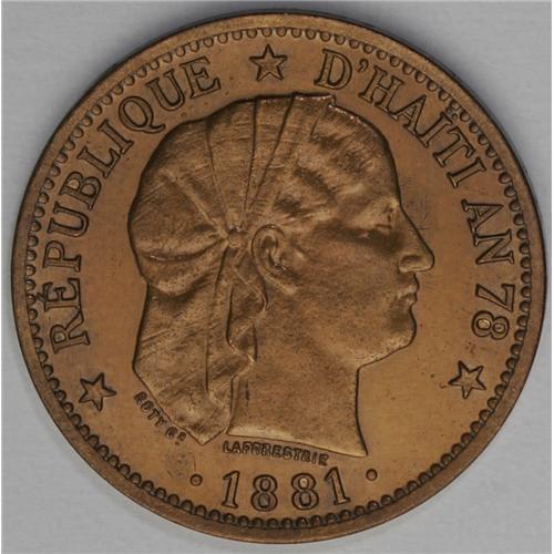 <B>Republic Proof 2 Centimes 1881, </B></I>KM43, Proof, lightly cleaned long ago and now nicely toned. Very scarce.