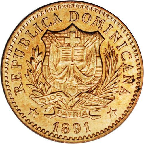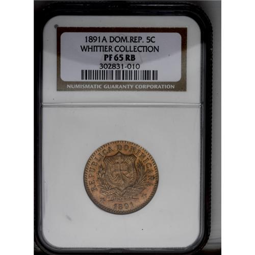 <B>Republic Proof 5 Centesimos 1891A, </B></I>KM8, Proof 65 NGC Red & Brown, razor sharp details and full mint luster, very rare in Proof.