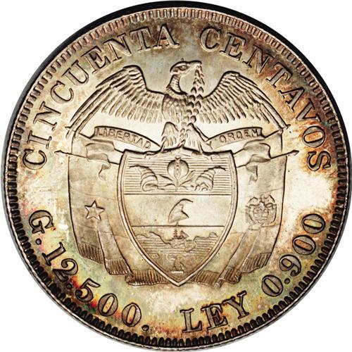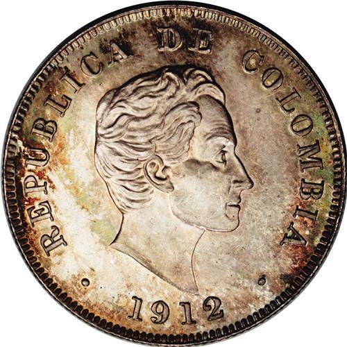 <B>Republic Proof 50 Centavos 1912, </B></I>KM193.1, Proof 66 NGC, a superb coin with multihued old-time toning and glittering mirror surfaces. Believed to have been struck at the Heaton Mint, Birmingham, England and sold in the Mint Archives Collection. Extremely rare and a coin with immediate eye appeal. BC71.
