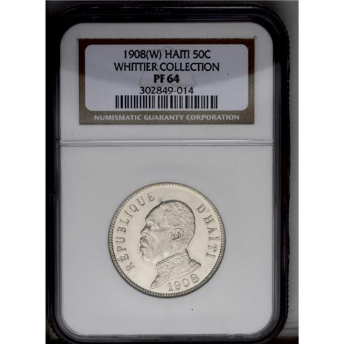 <B>Republic Proof 50 Centimes 1908, </B></I>KM56, Proof 64 NGC, a choice example with extremely sharp details and full mirror surfaces.