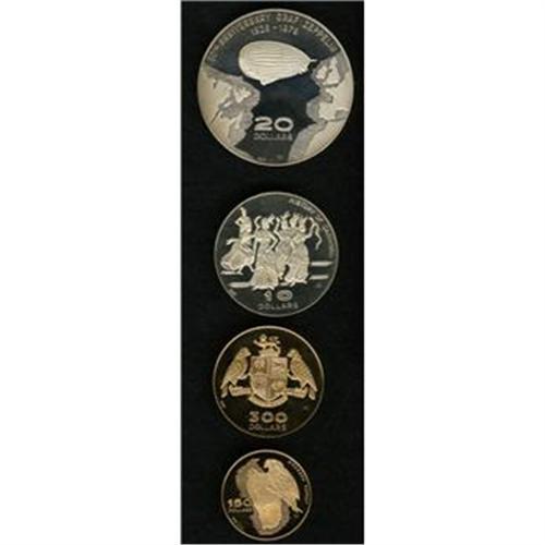 <B>Republic Proof Set 1978, </B></I>KM-PS2 featuring: KM12.3 10 Dollars (mintage 233 pieces), KM13.2 20 Dollars (mintage 233 pieces), KM14.2 gold 150 Dollars (mintage 116 pieces) and KM15.2 gold 300 Dollars (mintage 82 pieces) all presented in the original case with the certificate of authenticity. This is the Canadian Mint issued set and is much rarer than the Valcambi Mint issued set. The maximum number of possible sets is 82, limited by the tiny issue of the 300 Dollar piece. This is the only Canadian issue set that we have seen and we consider the Krause price to be quite low as they were unaware of this set until our consignor brought it to their attention.