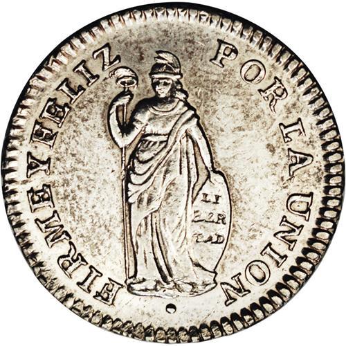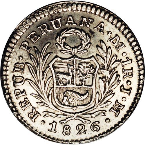 <B>Republic Real 1826-JM Lima, </B></I>KM145.1, MS63 NGC, very sharply detailed with reflective surfaces indicating an early die state, rare first date of this denomination.