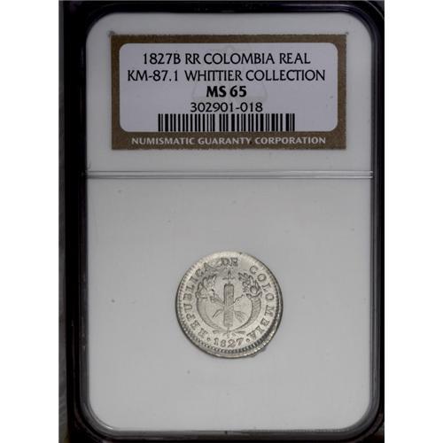 <B>Republic Real 1827-RR Bogota, </B></I>KM87.1, MS65 NGC, a sparkling example of this initial date with full frosty white luster and well executed design details. Very rare grade!