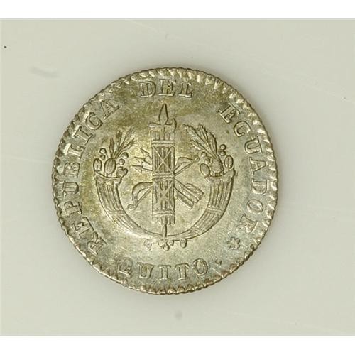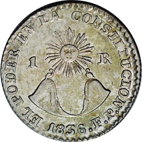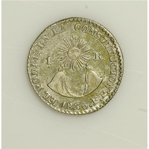 <B>Republic Real 1836-FP, </B></I>KM17, lightly toned AU-UNC with full underlying mint luster, sharply struck throughout with no flaws to the planchet. A remarkable example for this early coinage and certainly one of the finest known.<BR><I>From the Shinholser Collection</B></I><BR><BR><b>Shipping:</b> Coin/Currency (<a target="_blank" href="http://www.heritageauctions.com/common/shipping.php">view shipping information</a>)