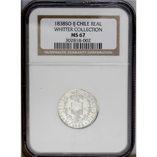 <B>Republic Real 1838-IJ, </B></I>KM94.1, MS67 NGC, completely brilliant with dazzling mint luster, a true "wonder-coin" and undoubtedly the finest extant. Extremely rare grade and the first date of the condor Real series.