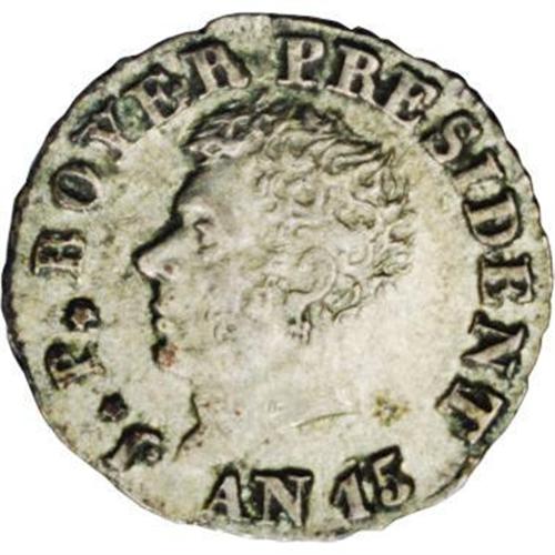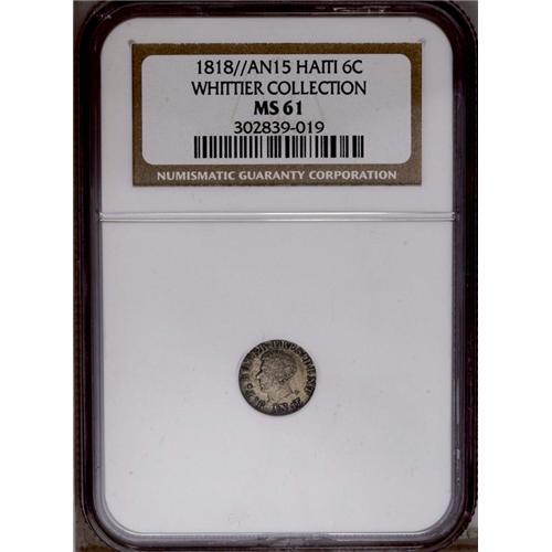 <B>Republic Silver 6 Centimes An 15 (1818), </B></I>KM17, MS61 NGC, well-struck details and old-time toning, very scarce grade for this tiny issue featuring the bust of President Boyer.
