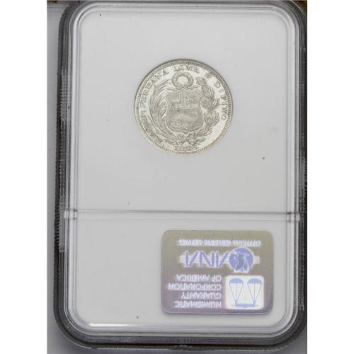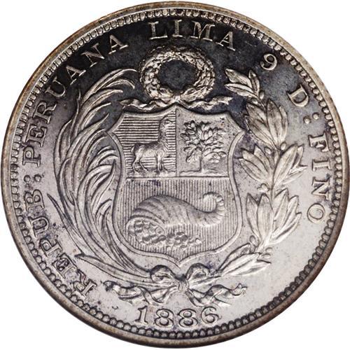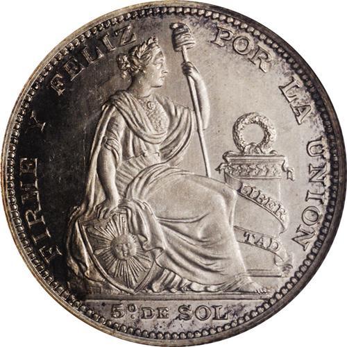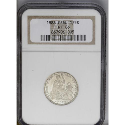 <B>Republic Silver Pattern 1/5 Sol 1886 Lima, </B></I>KM-PnC26, Proof 66 NGC, a superb coin with virtually perfect mirror surfaces and dazzling mint brilliance. Very rare with a reported mintage of 6.