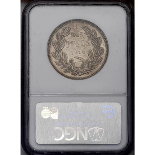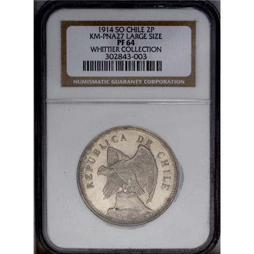 <B>Republic Silver Pattern 2 Pesos 1914, </B></I>KM-PnA27, Proof 64 NGC, large planchet with coin alignment, highly attractive example with gleaming, proof surfaces, ex-Yudelevich Collection.