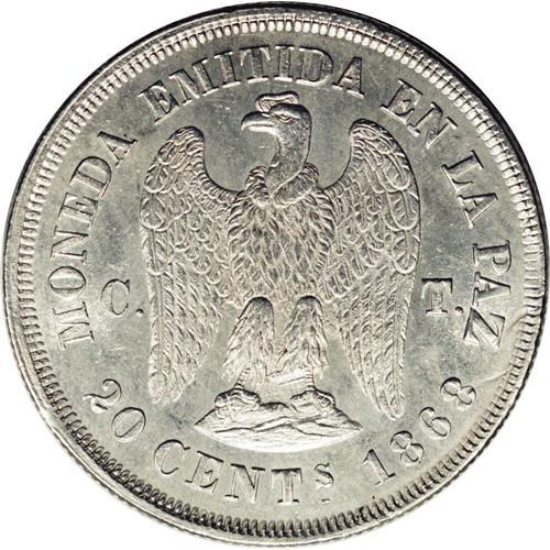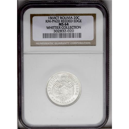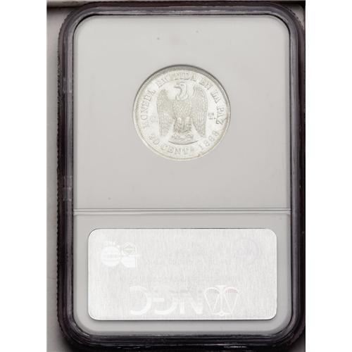 <B>Republic Silver Pattern 20 Centavos 1868, </B></I>KM-Pn20, reeded edge, MS64 NGC, a lustrous example of this very scarce series.
